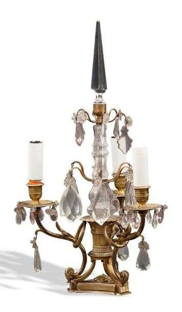 Paire de girandoles à pendeloques en bronze ciselé et doré à trois bras de