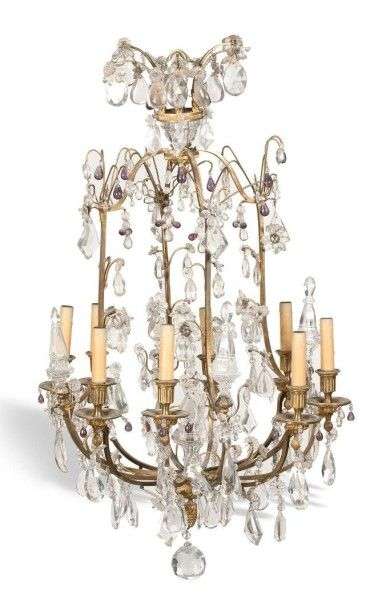 Lustre cage en bronze ciselé et doré à huit lumières agrémenté de pendeloques dont certaines améthystées et poignards.