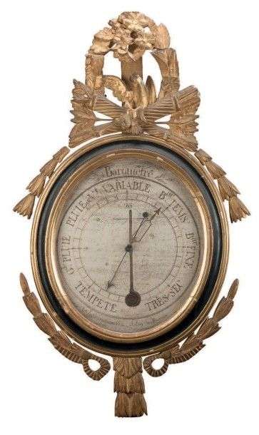 Baromètre selon Réaumur en bois mouluré sculpté, laqué noir et or.