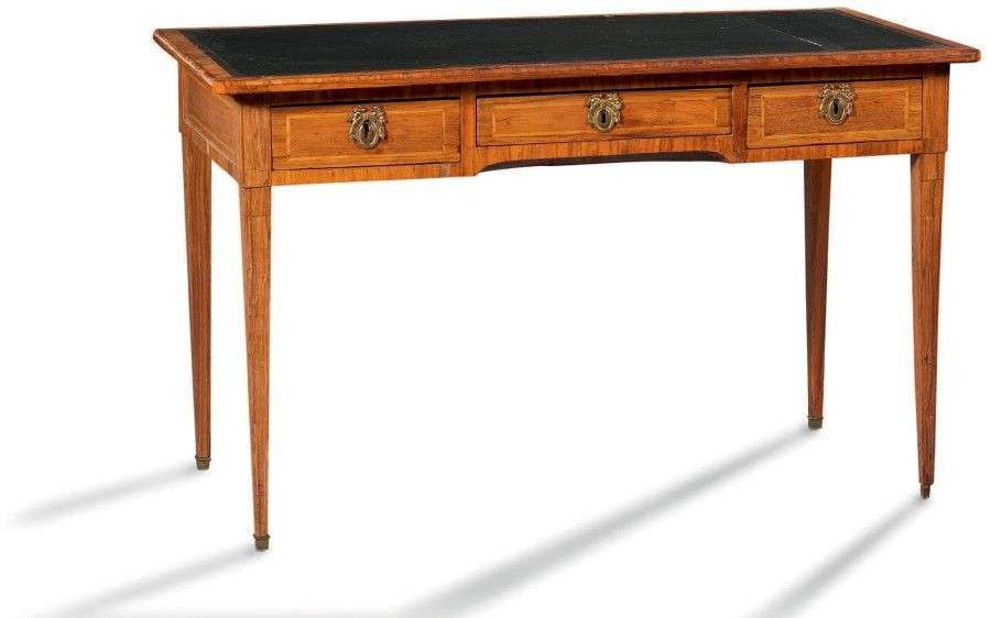 Petit bureau de dame de forme rectangulaire en placage de bois de rose dans des encadrements de filets. Il ouvre par trois tiroirs en façade et repose sur des pieds gaines.