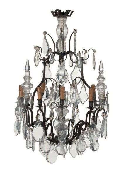 Lustre cage à huit lumières en fer forgé partiellement doré. Il est orné de pendeloques, certaines fumées ou améthystées et fleurettes