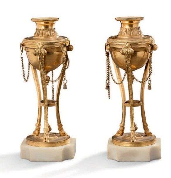 Paire de cassolettes formant bougeoirs en marbre blanc et bronze doré. Montants en console se terminant par des pieds biche et chaînettes.