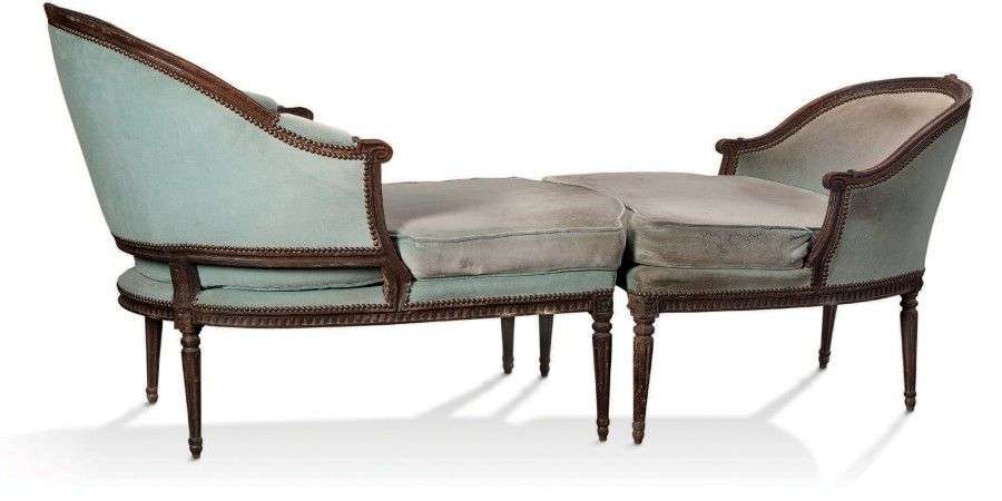 Duchesse-brisée en bois naturel mouluré et sculpté reposant sur des pieds cannelés et rudentés, les accotoirs finissant par des enroulements, à décor de cannelures sur la ceinture et de fleurs sur les dais de raccordement.