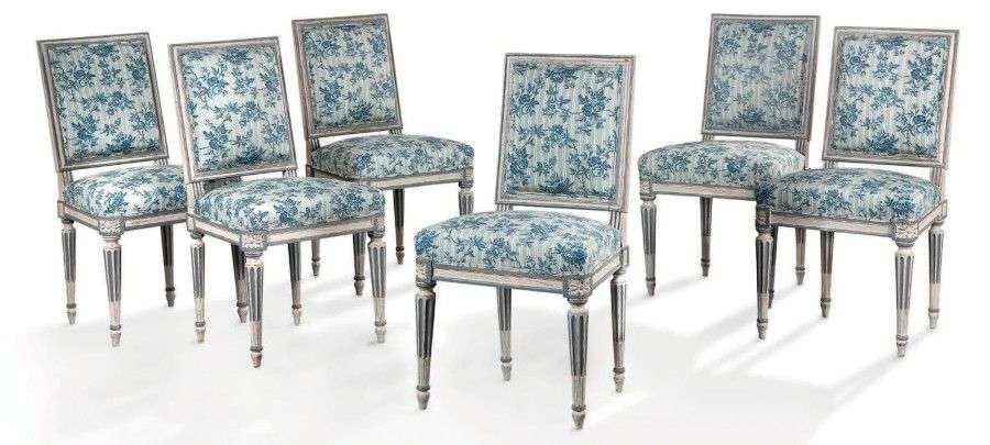 Suite de six chaises à dos plat en bois mouluré, sculpté, laqué crème et rechampi bleu.