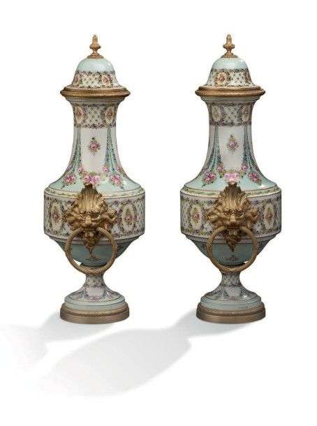 Paire de vases balustres en porcelaine à décor polychrome de guirlandes de fleurs et croisillons sur fond céladon.