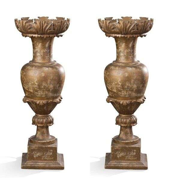 Paire de vases simulés en albâtre tourné, sculpté et patiné or. Les cols à larges feuilles d'acanthe, le culot à raie de coeurs, piédouches circulaires, base quadrangulaire à doucine.