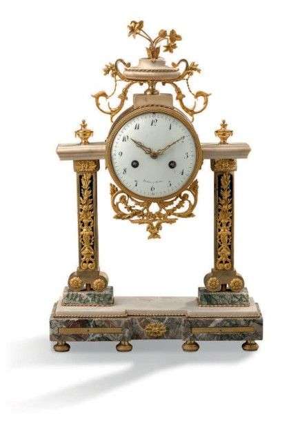 Pendule portique en marbre blanc, marbre veiné et bronze ciselé et doré.