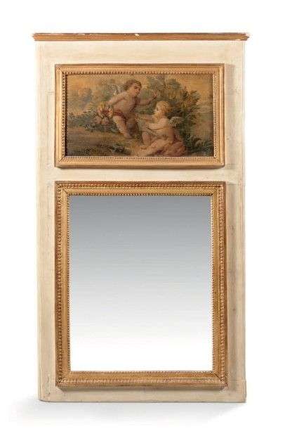 Trumeau en bois laqué crème et doré sculpté de rangs de perles et raies de coeur