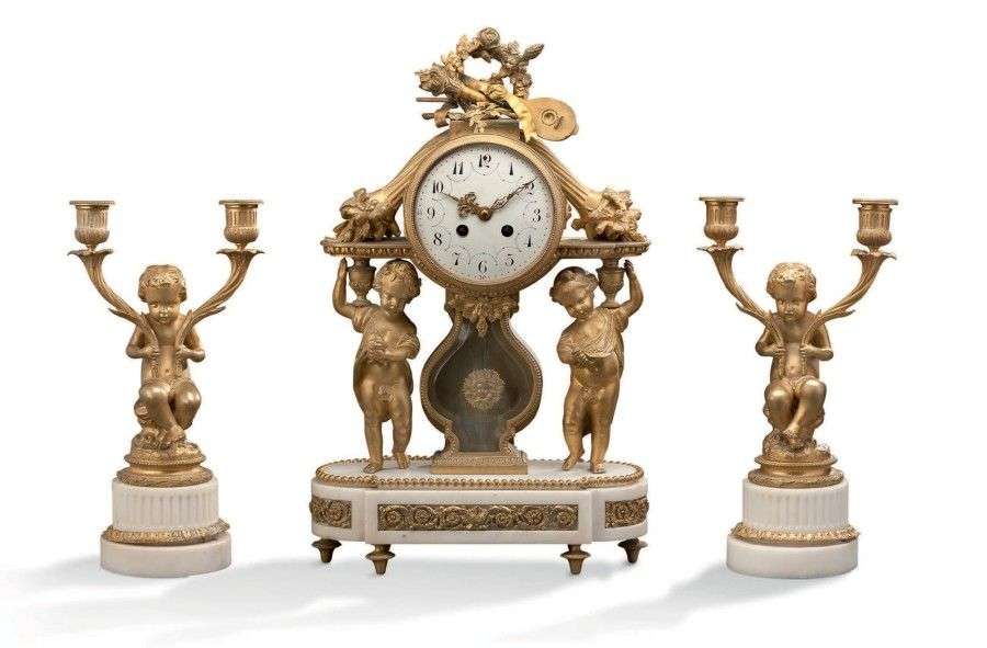 Garniture de cheminée en marbre blanc et bronze ciselé et doré.
