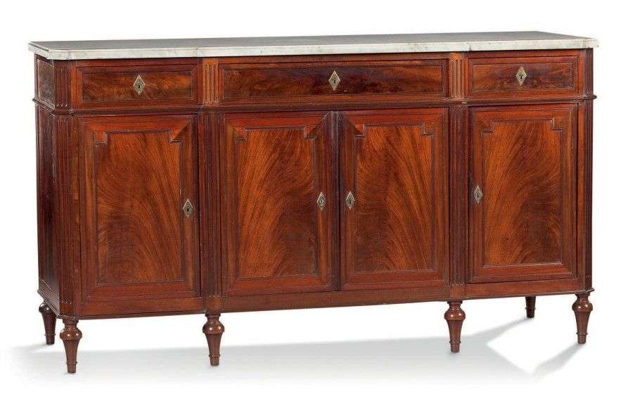 Enfilade en acajou et placage d'acajou mouluré, elle ouvre par quatre portes et trois tiroirs.