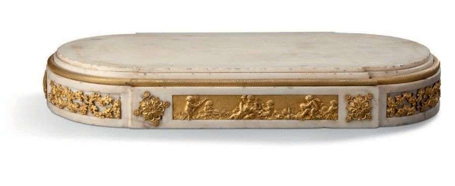 Socle en marbre blanc mouluré et bronze doré à décor au centre d'une frise de putti dans le gout de Clodion et d'une frise de feuilles de chênes.