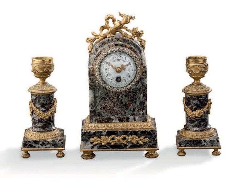 Petite garniture de cheminée en marbre et bronze ciselé et doré.