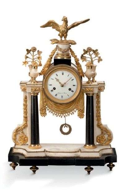 Pendule dite «portique» en marbres blanc et noir et bronze ciselé et doré