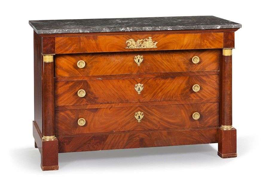 Commode en acajou et placage de ronce d'acajou| de forme rectangulaire, elle ouvre par quatre tiroirs, dont un en ceinture| montants en colonnettes détachées| ornementation de bronze ciselé, moleté ou doré.