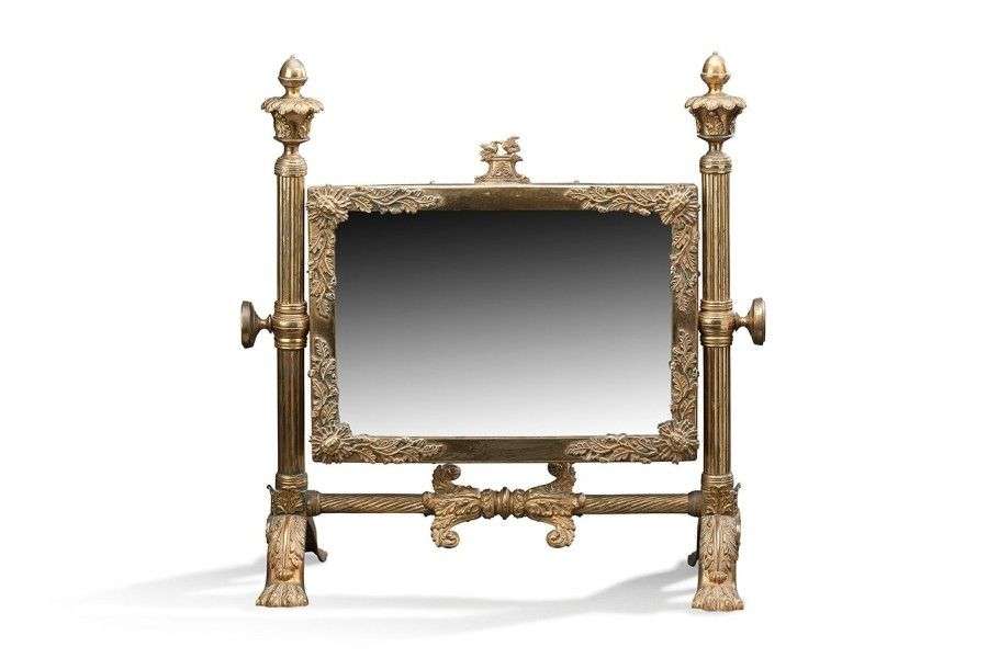 Psyché en bronze ciselé. Le miroir de forme rectangulaire surmonté des att