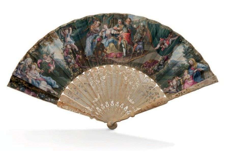 Eventail a feuille peinte d'une scène d'une scène galante dans une persective de paysage et palais| et d'angelots.