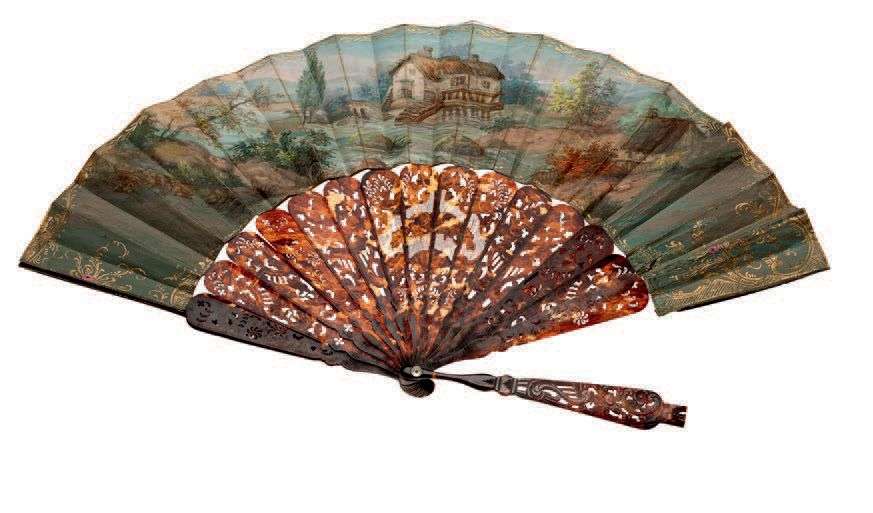 Eventail à monture en écaille repercée, à décor peint d'un paysage