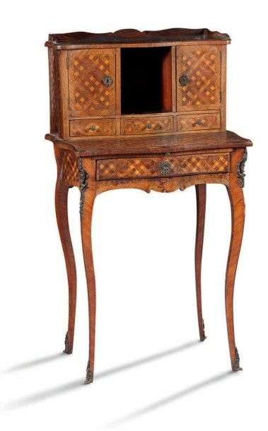 Petit bureau bonheur du jour en marqueterie à décor de cubes.