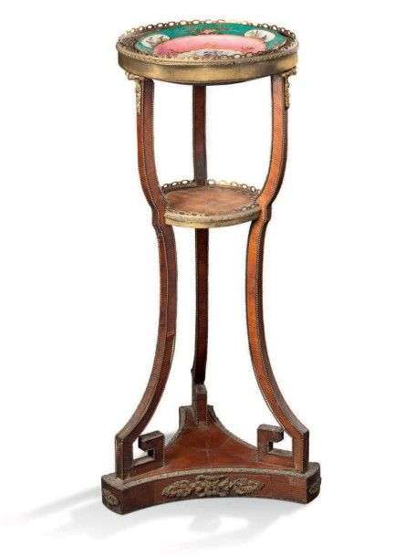 Guéridon en athénienne en placage de bois de rose, le plateau circulaire accueille une assiette de porcelaine à décor de bouquets de fleurs et volatiles dans des réserves.