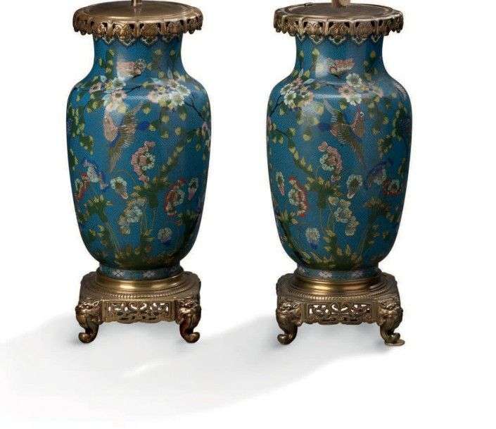 Paire de lampes en émail cloisonné à décor de papillons et branchages fleu