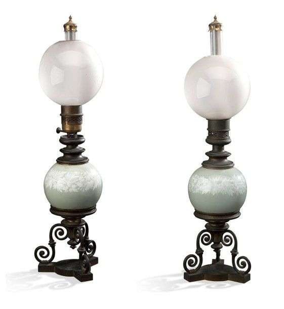 Paire de lampes à huile en laiton et porcelaine. Les panses sphériques à d