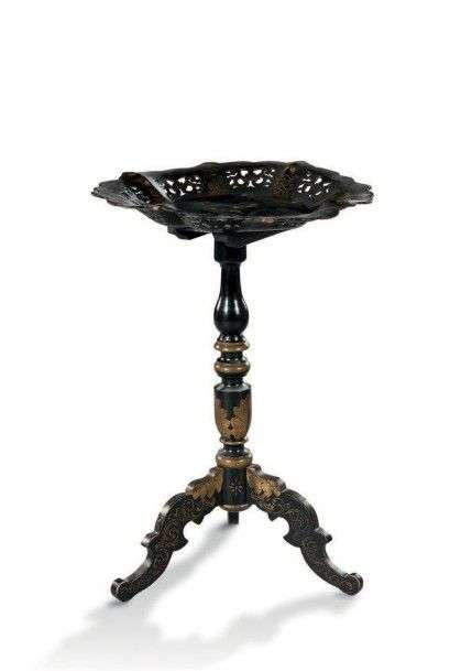 Petit guéridon vide poche en bois et papier mâché à décor or d'une scène chinoise sur fond noir. Piètement tripode.