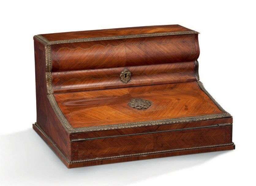 Ecritoire en placage de bois de rose, marqueté en feuille dans des encadrements de filets.
