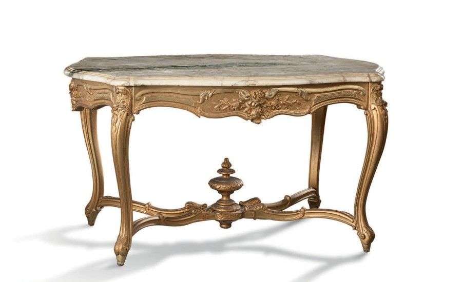 Table de milieu de forme chantournée en bois mouluré, sculpté et redoré, à décor de bouquets fleuris et acanthes. Elle ouvre par un tiroir latéral et repose sur des pieds cambrés réunis par une entretoise surmontée d'un pot à feu. Plateau de marbre veiné.