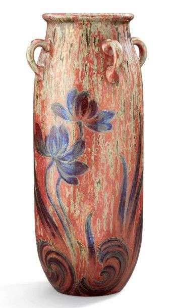 Grand vase tubulaire à anses en faïence émaillée irisée rouge à motifs floraux mauves.