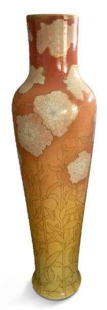 Grand vase en céramique émaillée jaune nuancé orange à motifs floraux.