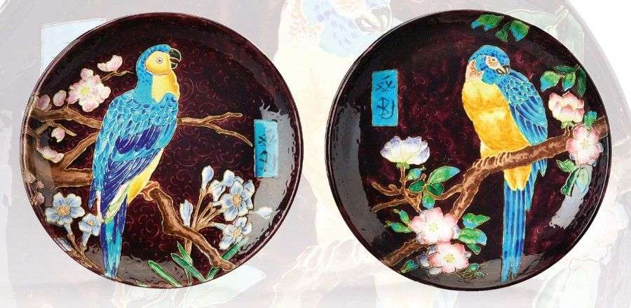 Suite de deux plats creux circulaires en céramique émaillée polychrome à décor en léger relief de cacatoès branchés à motifs fleuris sur fond aubergine à volutes.