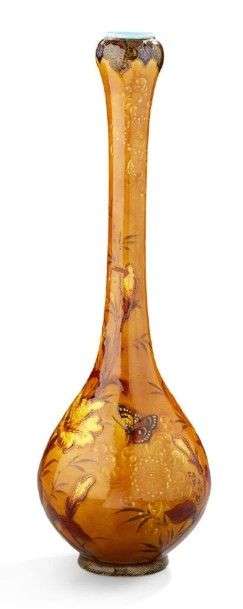 Vase soliflore en faïence émaillée ocre à décor de papillons et de motifs flloraux rehaussés d'or.
