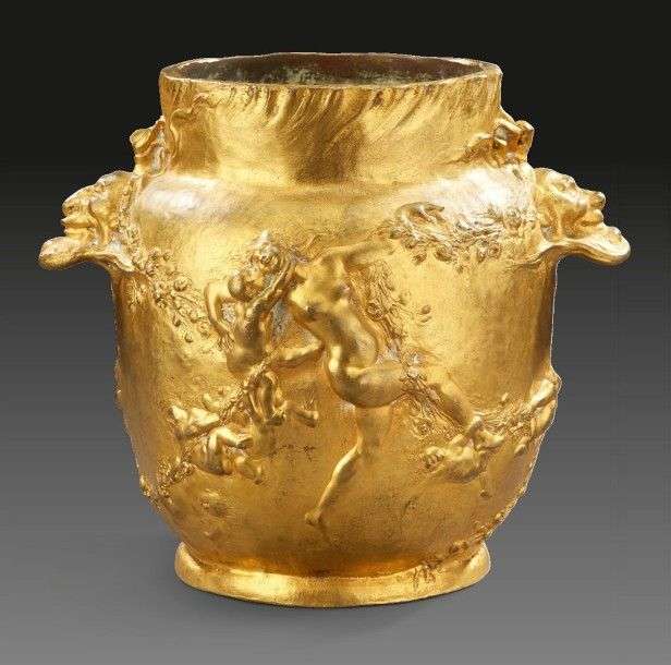 A gilded bronze vase with putti, nymphs and flowers motifs.