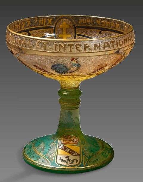 Coupe à piédouche en verre multicouche à décor dégagé en camée à l'acide et à rehauts d'or. la base est ornée d'armoiries de la ville de Nancy et de la devise "qui s' y frotte s'y pique". Sur la panse, dans deux réserves, un coq sur un rameau de chêne au soleil levant souligné de la légende Vigilat, et un alérion surmonté de la croix de Lorraine agrémentées de chardons.