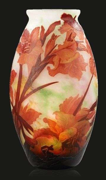 Vase ovoïde en verre doublé à décor dégagé à l'acide de motifs floraux rouges sur fond marmoréen blanc,vert, rose et jaune.