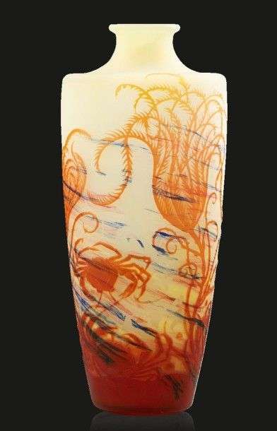 Haut vase en verre doublé à décor dégagé à l'acide de crabes et de motifs floraux aquatiques rouges et bleus sur un fond opaque jaune.