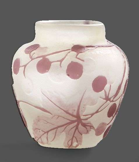 Vase miniature en verre doublé à décor dégagé à l'acide de motifs fruitiers mauves sur fond opaque.