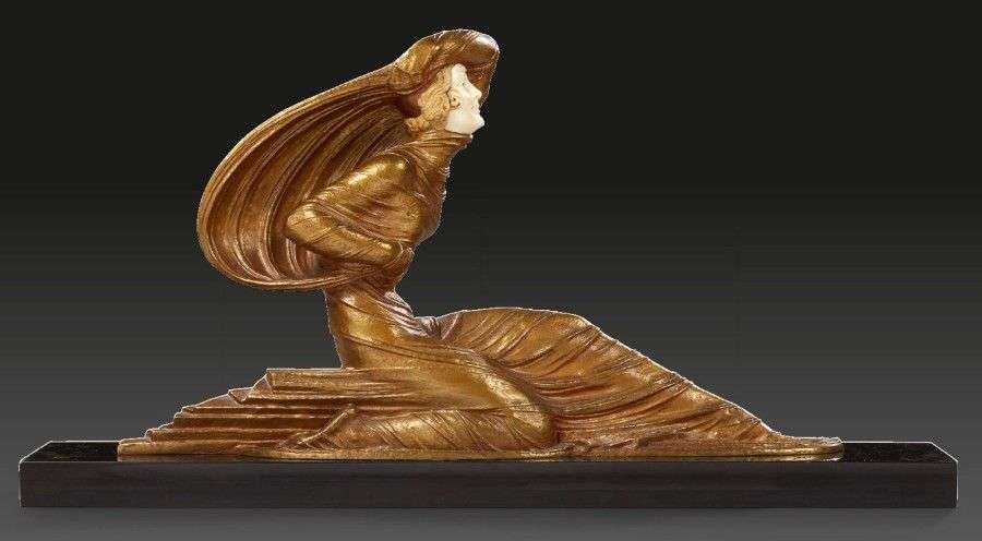 Rare sculpture en bronze doré et ivoire partiellement patiné dite chryséléphantine.