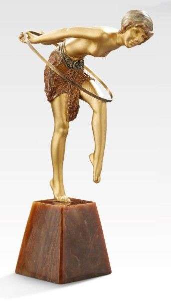 Epreuve en bronze doré et patiné figurant une femme au cerceau, elle repose sur une base en onyx.