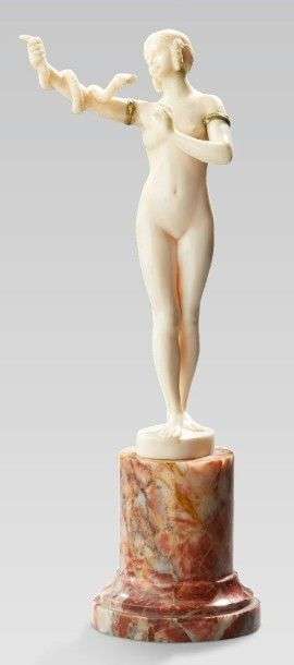 Sculpture en ivoire représentant une charmeuse de serpent sur un socle en marbre.