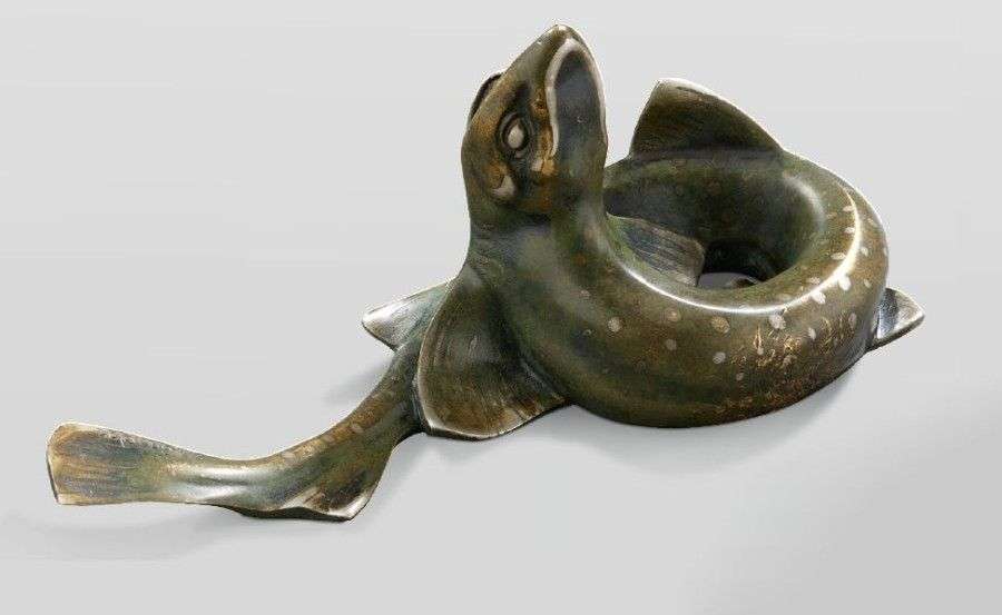 A green and silver patina bronze sculpture representing a conger named "sea dog".