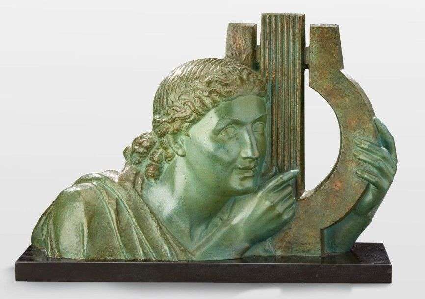 Green patina bronze representing a lyre player on a dark marble base.