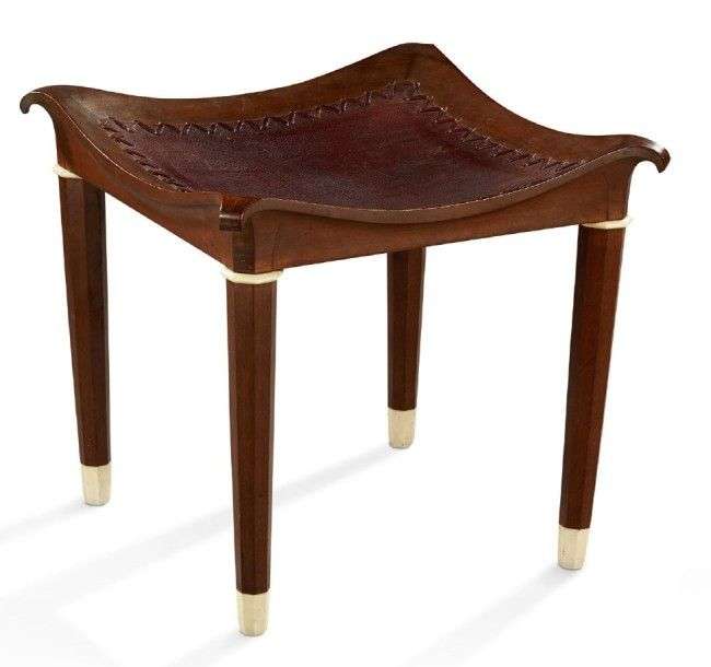 Tabouret en amarante sculpté à assise carrée à enroulement garnie d'un cuir rouge et reposant sur quatre montants fuselés octogonaux bagués et terminés par des sabots en ivoire.