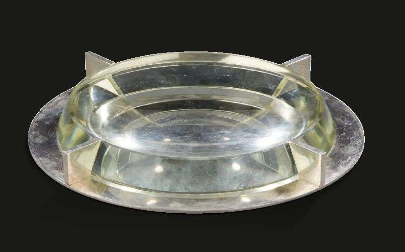 Vide-poche moderniste en verre épais translucide et armature en bronze nickelé.