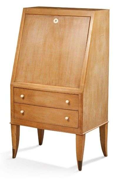 Secrétaire en placage de sycomore ouvrant par un abattant découvrant un intérieur compartimenté de tiroirs et d'une niche partiellement gainée de parchemin et deux tiroirs en façade. Il est orné d'une entrée de serrure et de boutons de tirage en ivoire sculptés. Il repose sur quatre pieds fuselés. Vers 1930-1940.