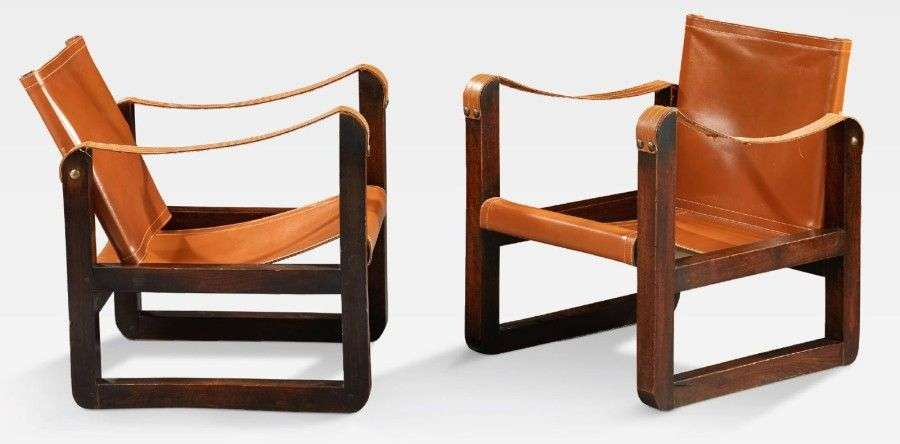 Beech armchairs with brown leather.