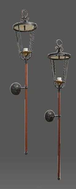 Pair of tubular black lacquered metal flares with brown leather. Circa 1950.