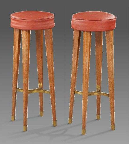 Paire de tabourets en chêne cerusé à pieds fuselés reliés par une entretoise et des sabots en bronze doré.