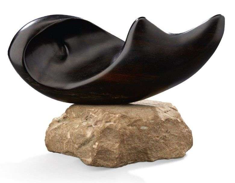 Sculpture de forme libre en ébène massif sur socle en pierre.