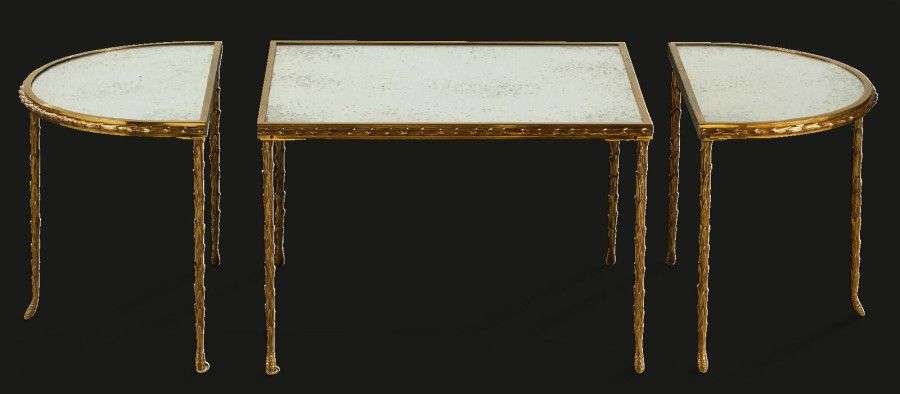 Set of three low tables in gilded bronze and miror with foliage motifs. Circa 1950.